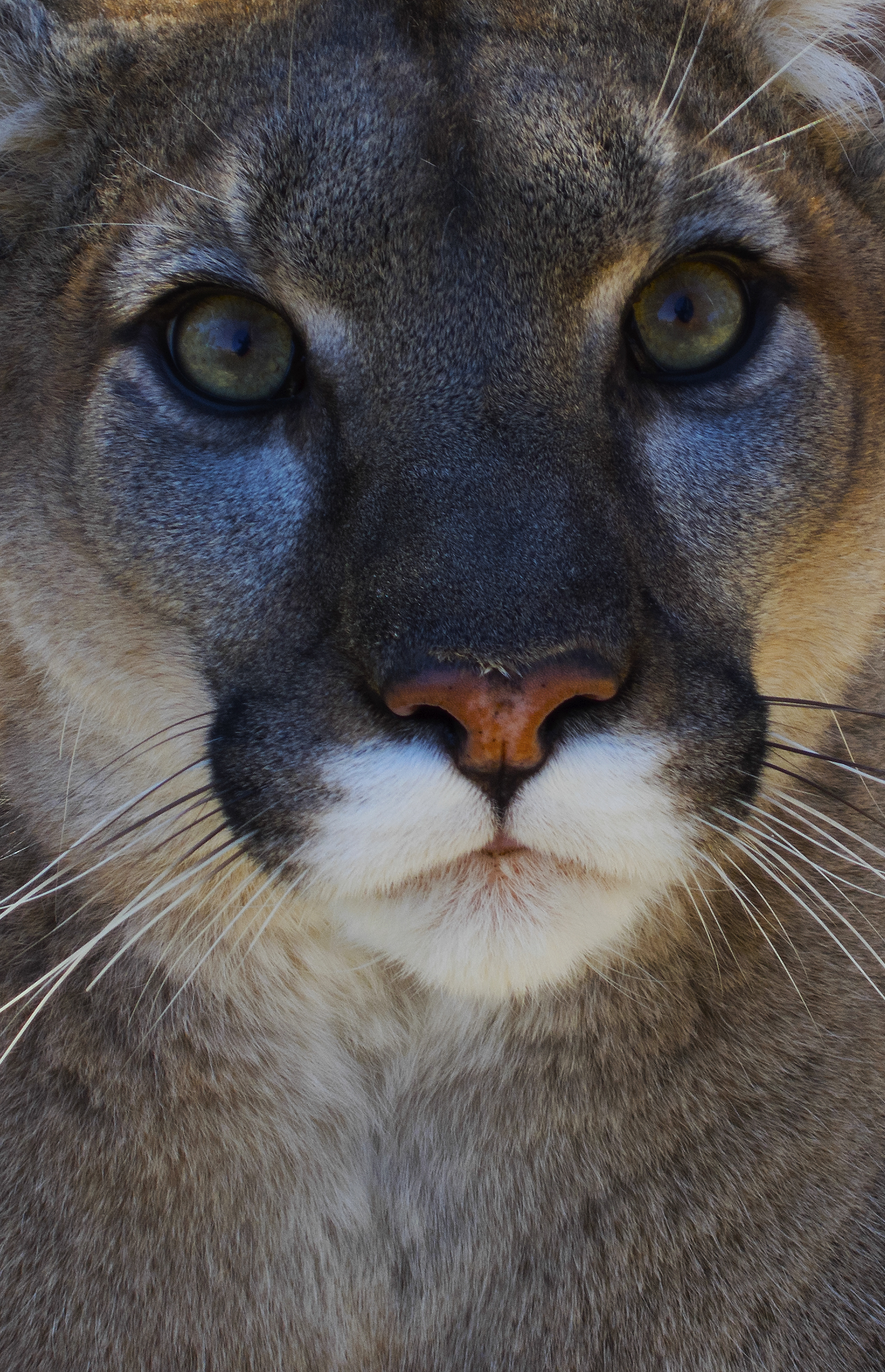 In the late afternoon, I was jogging at the top of a steep cliff and as I rounded a curve, I saw a large 100lb female Cougar sitting at the top off a bluff. Her torso was a cinnamon buff-colored contrasted by a white belly. She had two kittens with brownish-black irregular spots on the body and dark rings on the short tail.