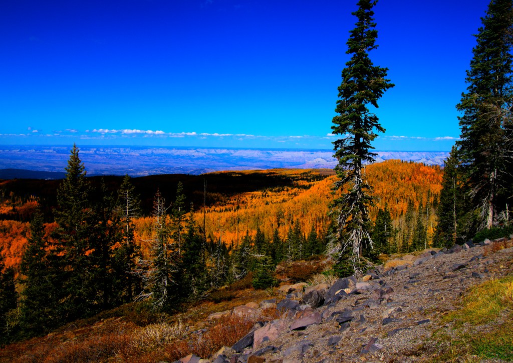 I was at my cabin I rented in the mountains around 10,500,’ for my 73rd birthday and I took these quick photos for fun. They include the cabin and a lake I walked down to on a very steep path to the boat dock—a bit of a challenge with my heavy camera equipment. I also photographed a colorful overlook, a trail I hiked, and surrounding Fall scenery. Although I did not take any photos I observed numerous Mule Deer throughout the day.